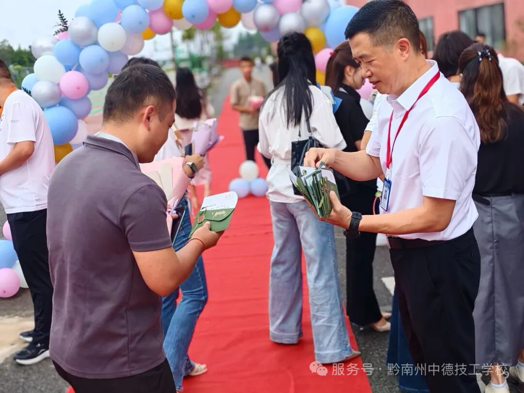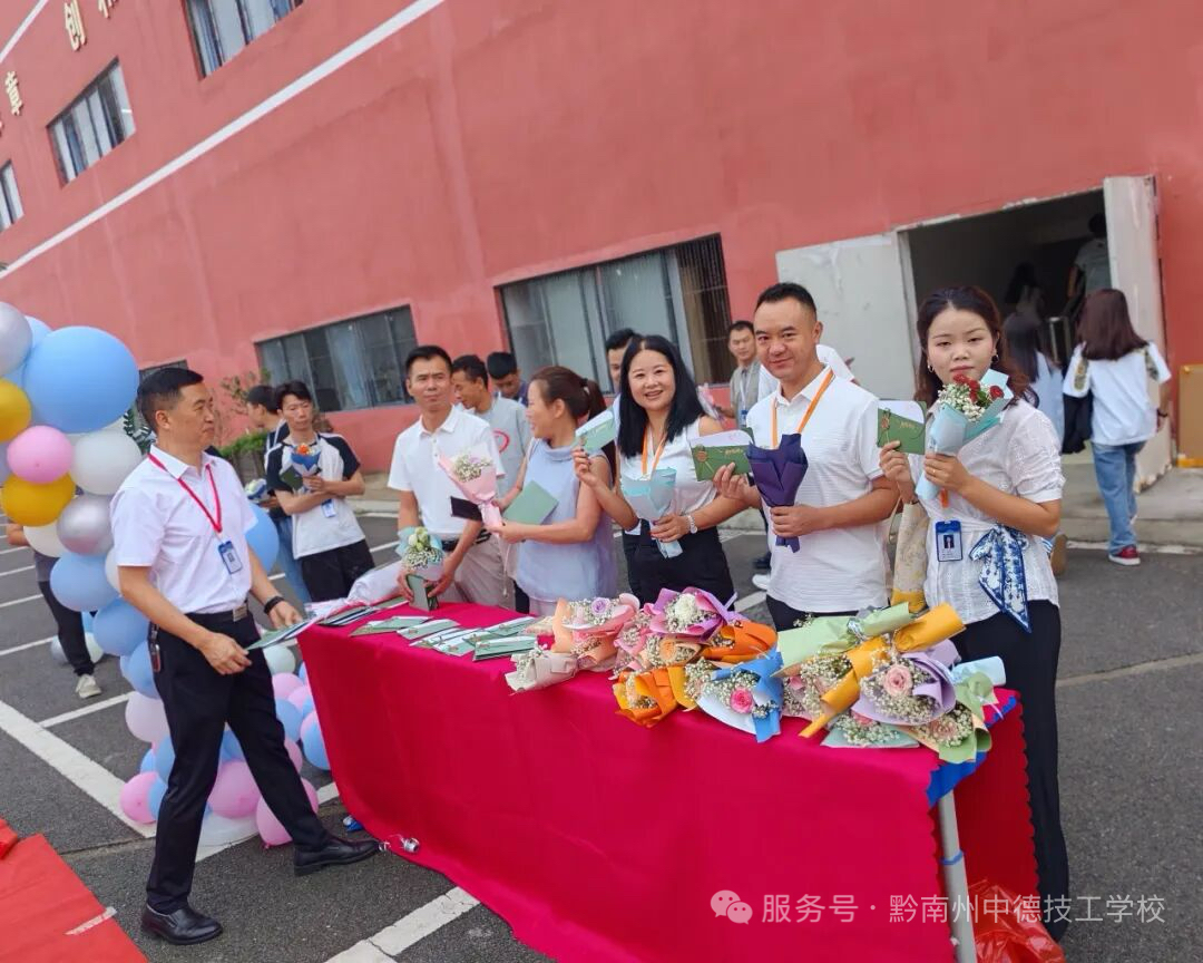 师恩化雨,匠心传承发表时间:2025-11-06 16:58 为庆祝第41个教师节,增强教师凝聚力、激发教学热情、营造尊师重教的良好风尚,9月10日黔南州中德技工学校成功举办了教师节系列庆祝活动,向全体教职工致以最诚挚的敬意与祝福。 上午7:50,学校小广场铺设红毯、气球拱门迎接每一位教职员工,校领导、中层干部、各教研组长及工会成员提前到场,向大家献上鲜花和贺卡,表达最诚挚的节日祝福。